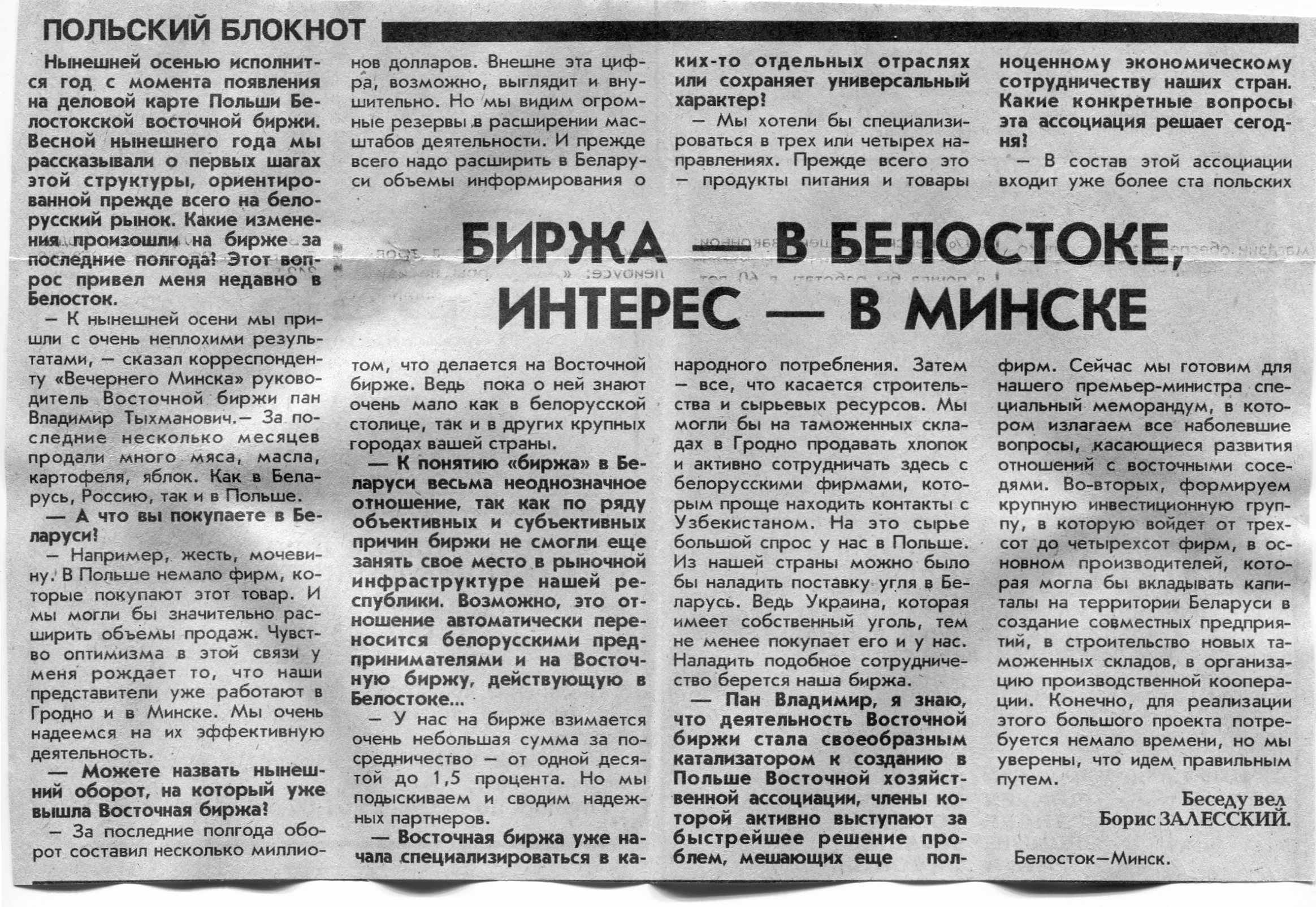 Залесский, Б. Биржа - в Белостоке, интерес - Минске / Б. Залесский // Вечерний Минск. - 1995. - 10 окт.
