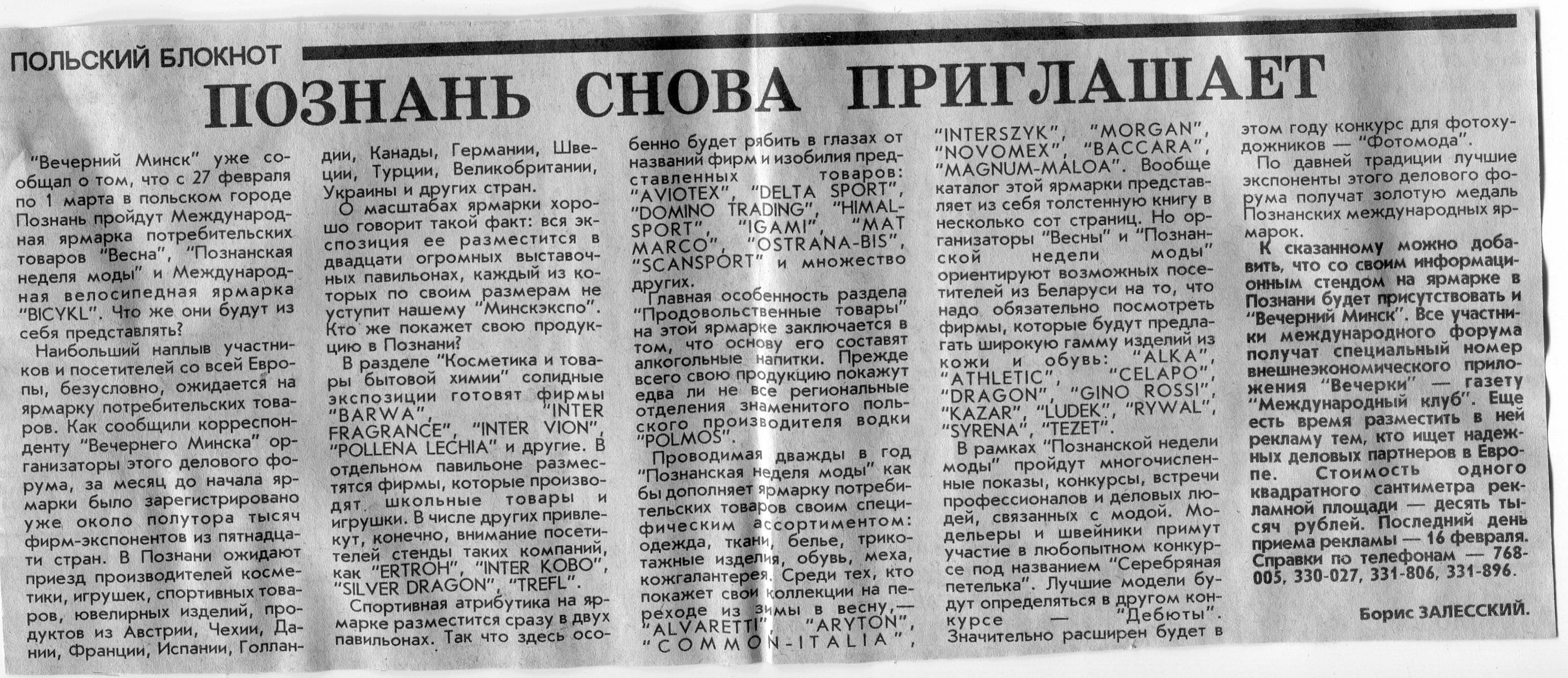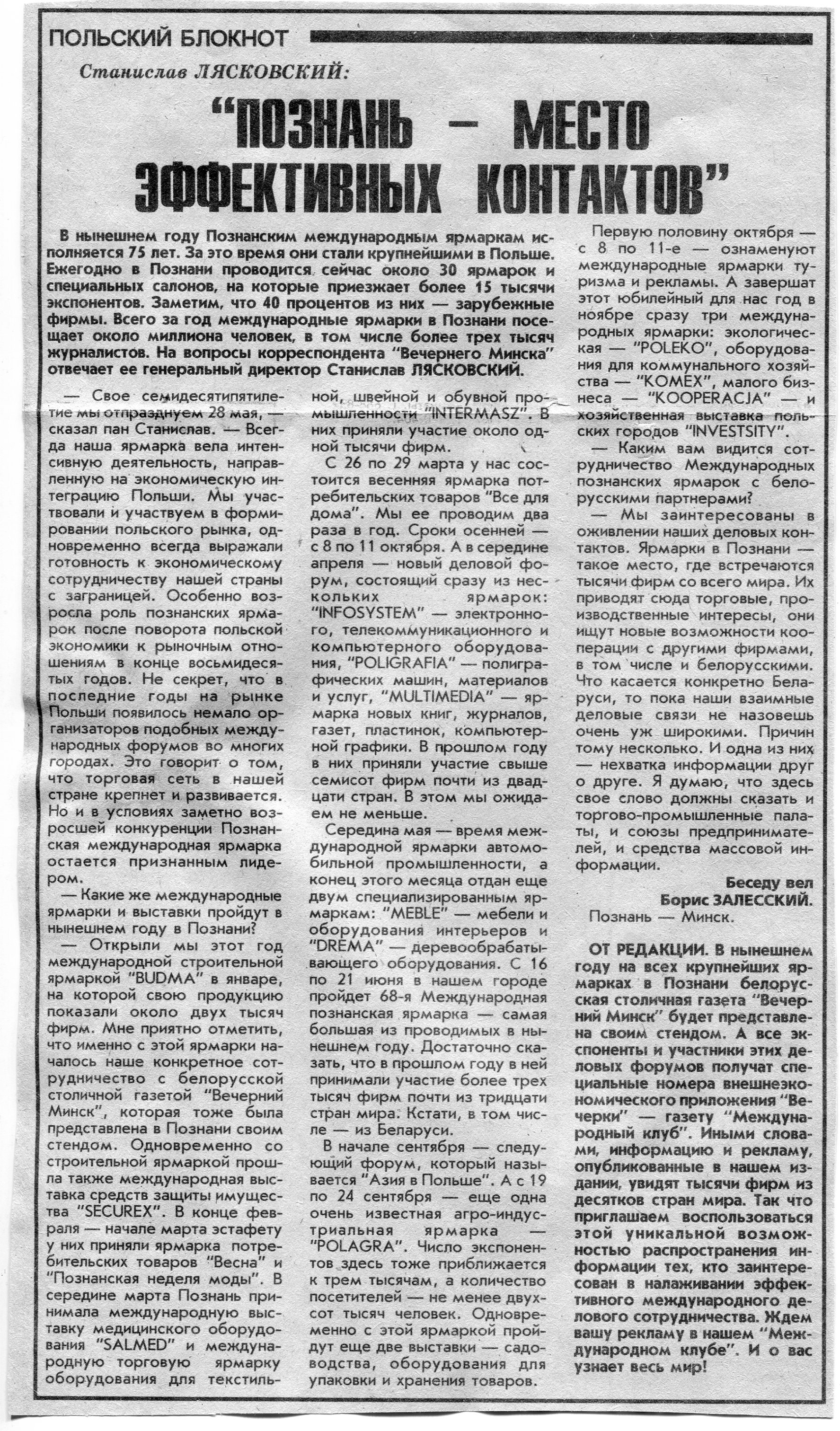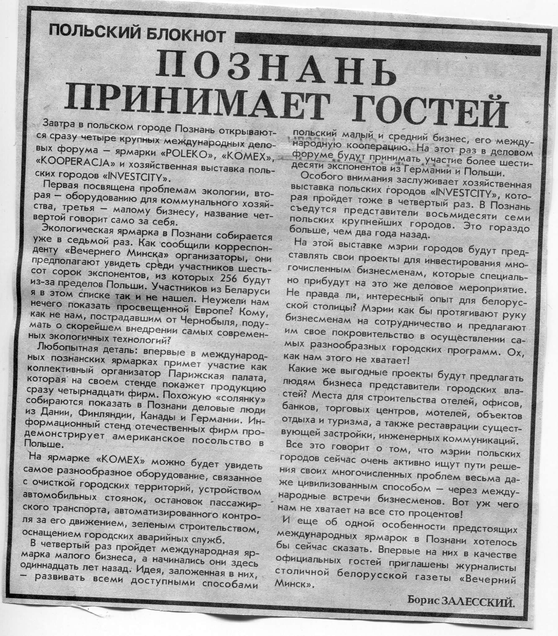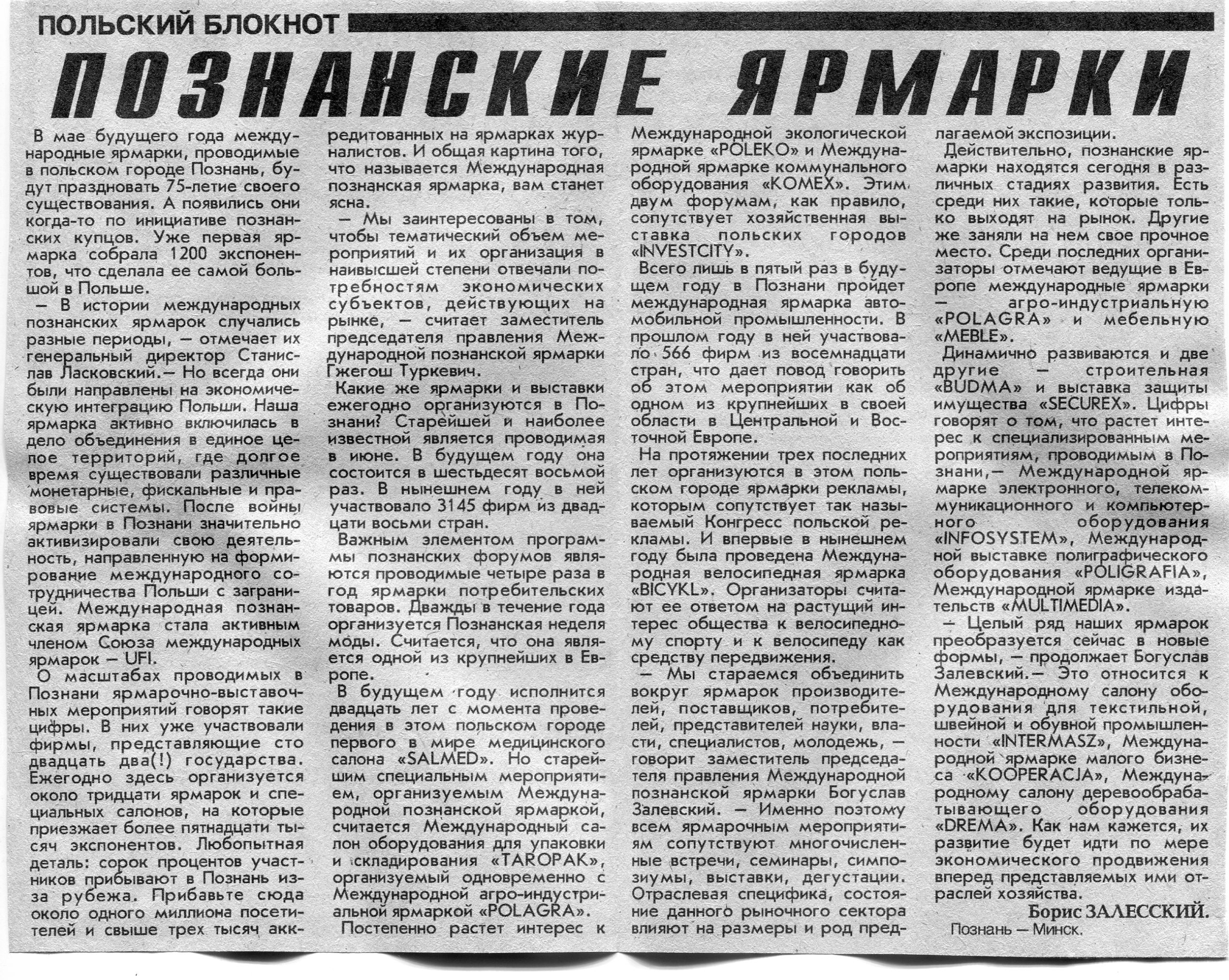 Залесский, Б. Познанские ярмарки / Б. Залесский // Вечерний Минск. - 1995. - 15 нояб.