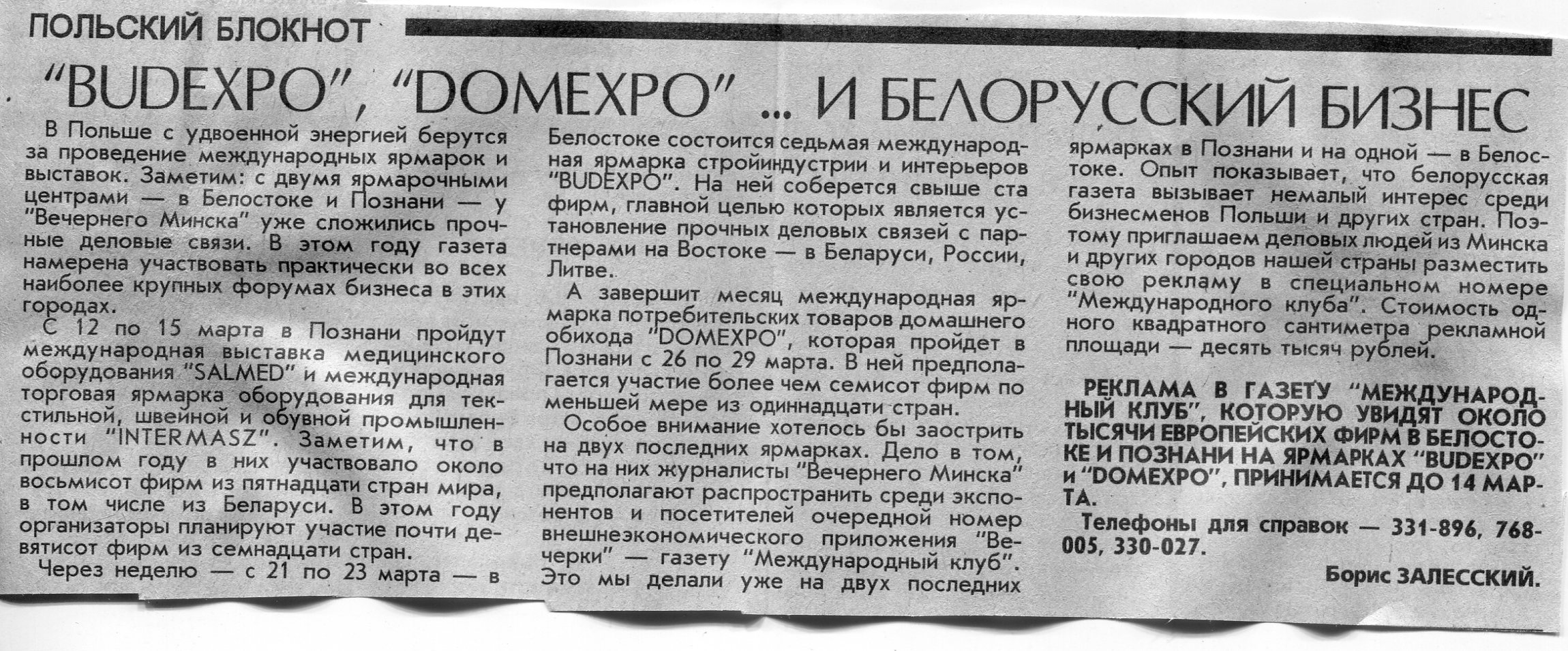 Залесский, Б. "Budexpo", "Domexpo" ... и белорусский бизнес / Б. Залесский // Вечерний Минск. - 1996. - 6 мар.
