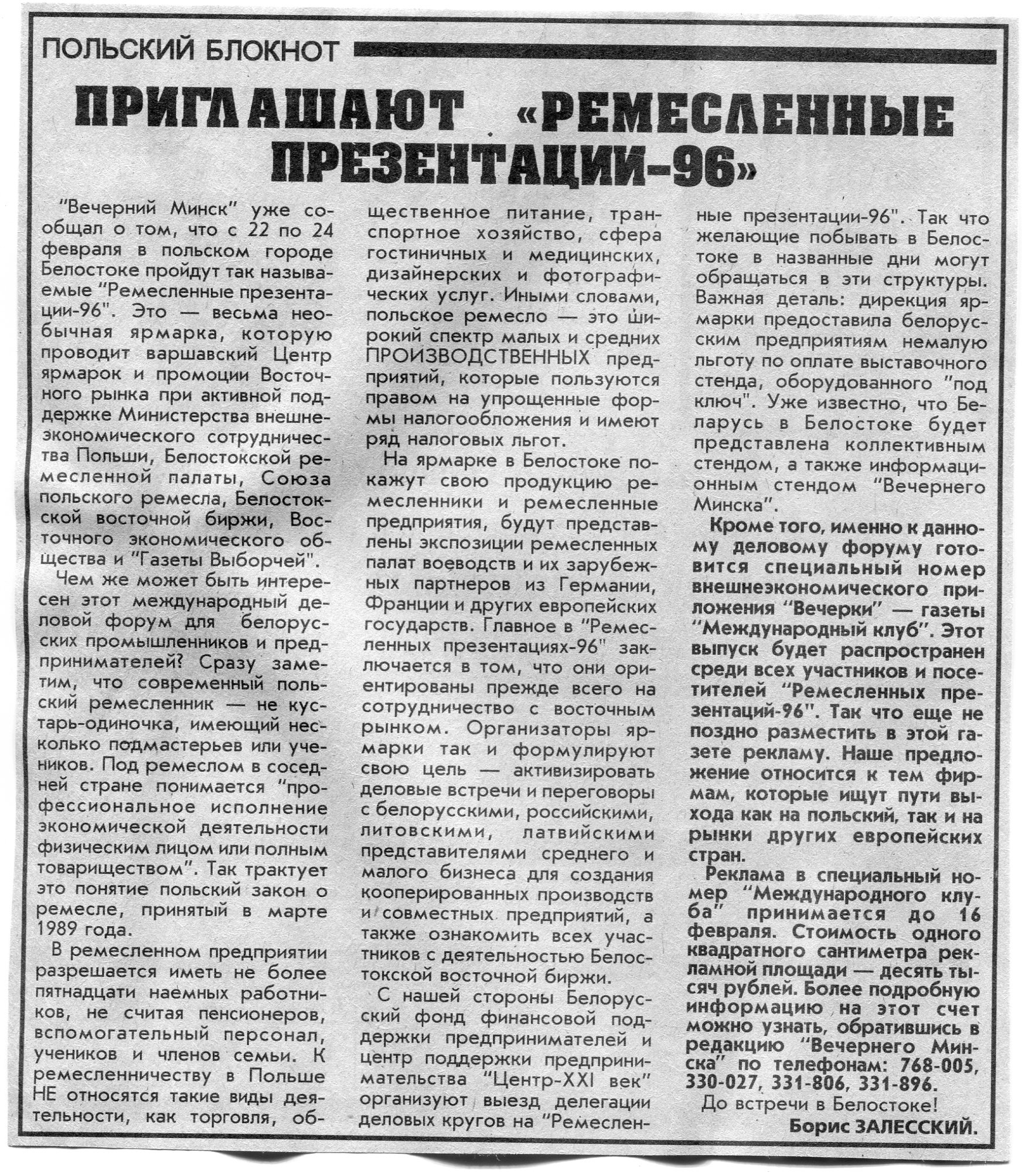 Залесский, Б. Приглашают "Ремесленные презентации-96" / Б. Залесский // Вечерний Минск. - 1996. - 14 февр.