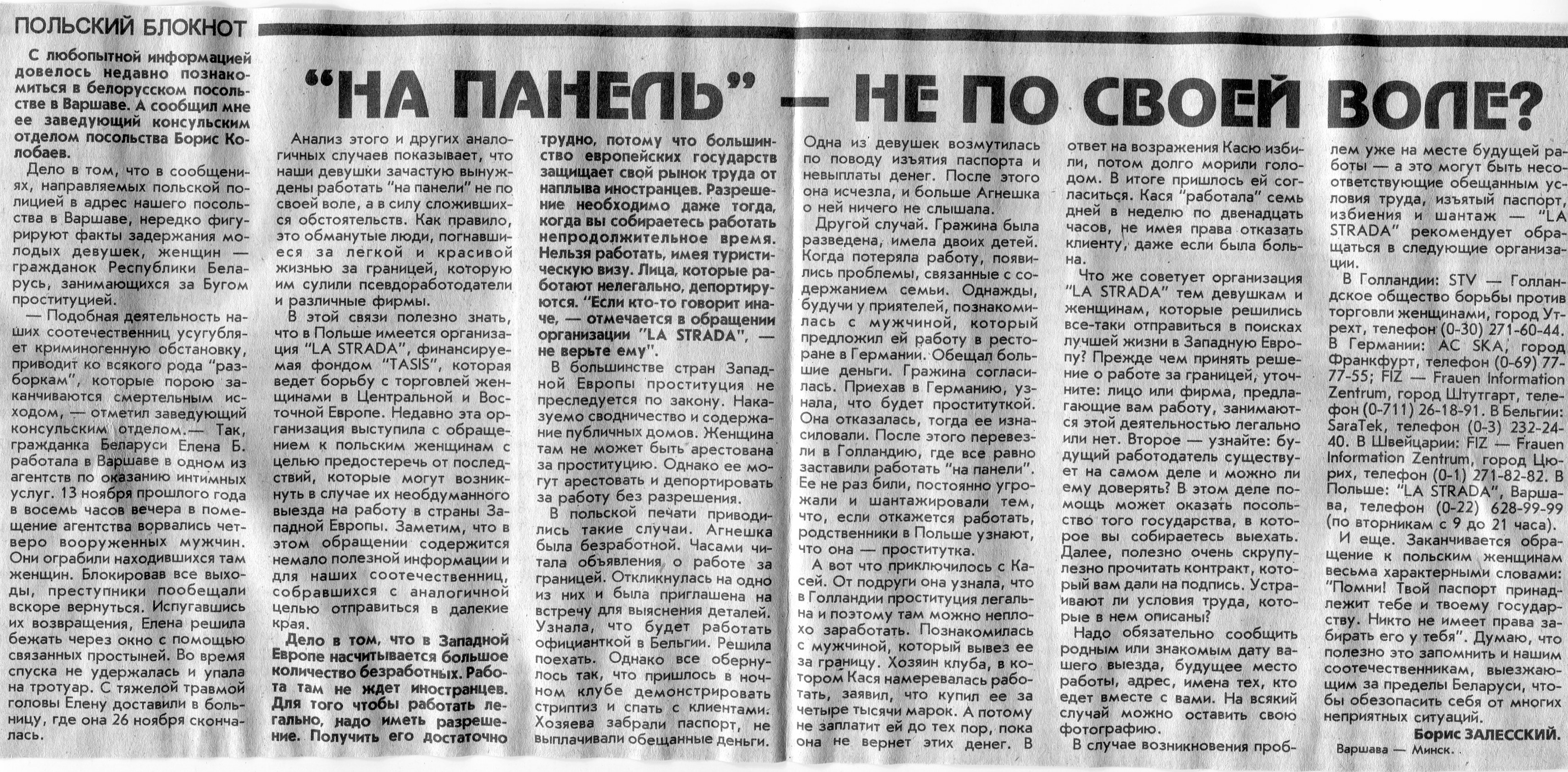 Залесский, Б. "На панель" - не по своей воле / Б. Залесский // Вечерний Минск. - 1996. - 25 мар.