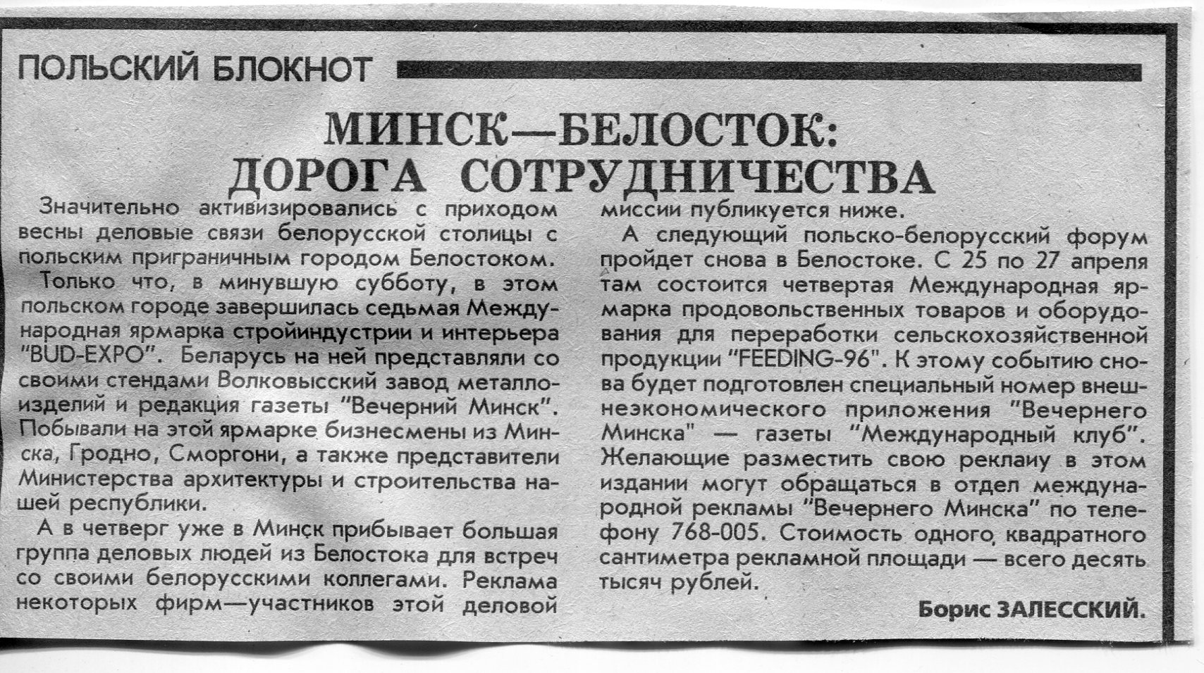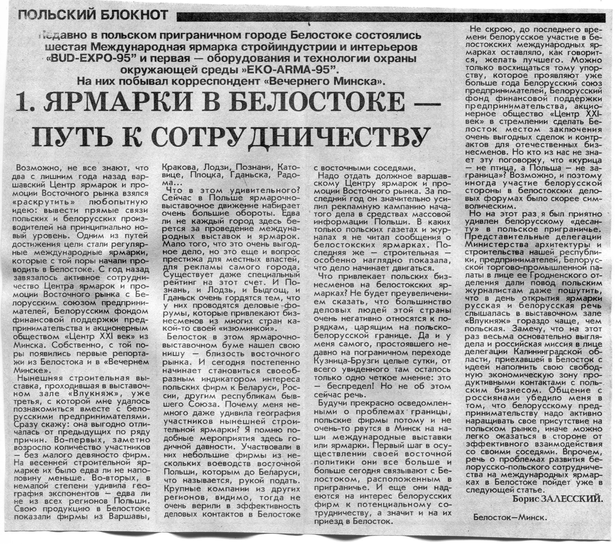 Залесский, Б. 1. Ярмарки в Белостоке - путь к сотрудничеству / Б. Залесский // Вечерний Минск. - 1995. - 3 нояб.