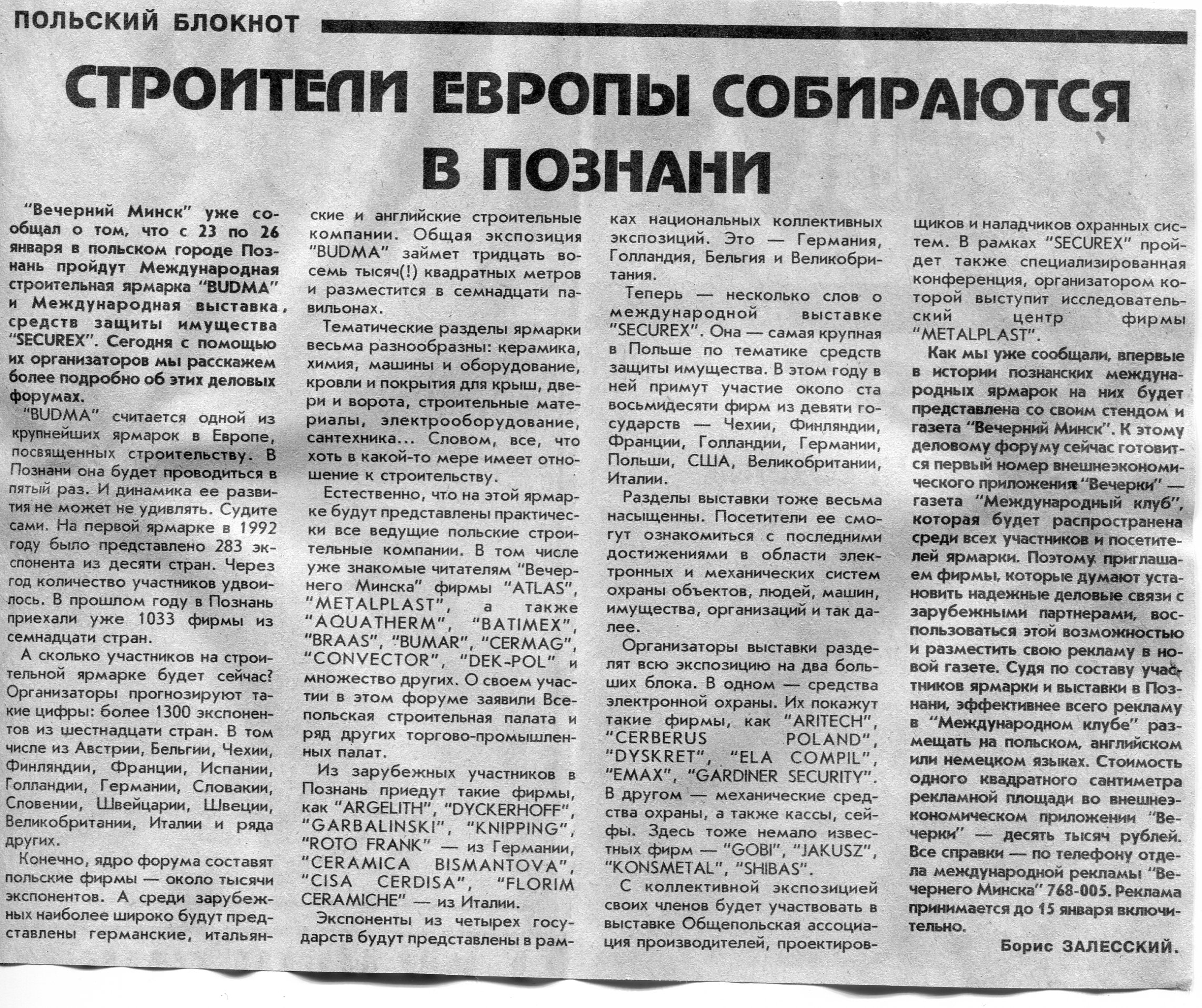 Залесский, Б. Строители Европы собираются в Познани / Б. Залесский // Вечерний Минск. - 1996. - 10 янв.