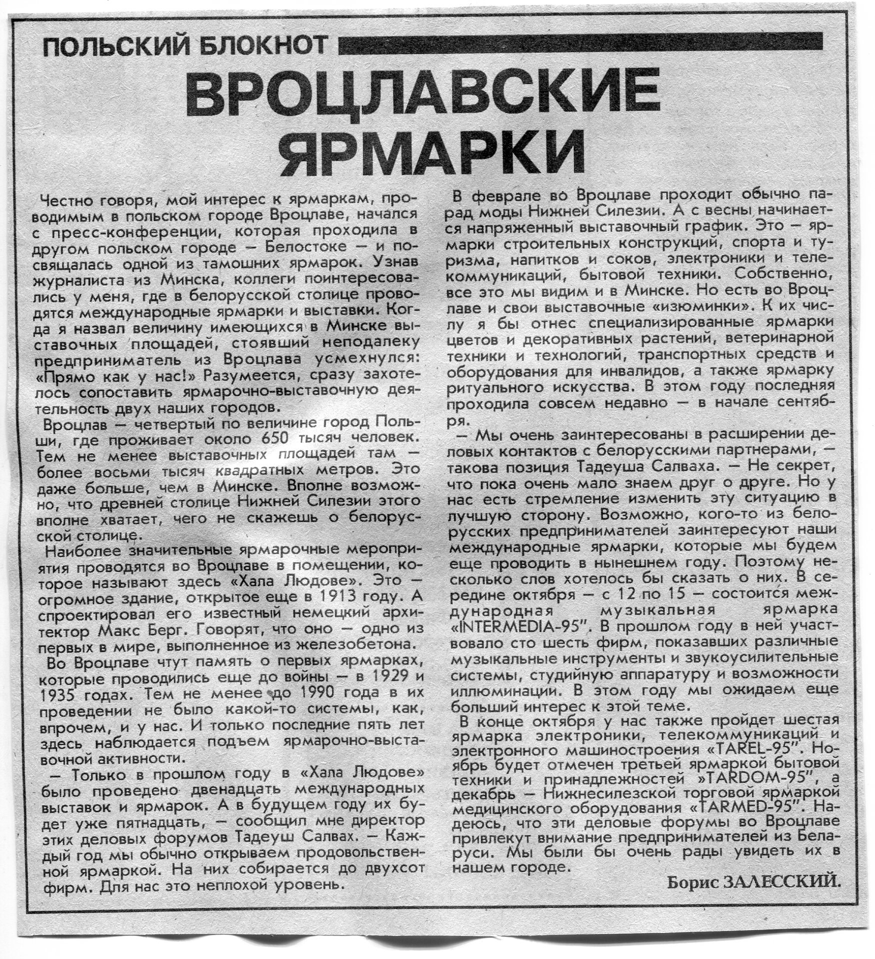 Залесский, Б. Вроцлавские ярмарки / Б. Залесский // Вечерний Минск. - 1995. - 2 окт.