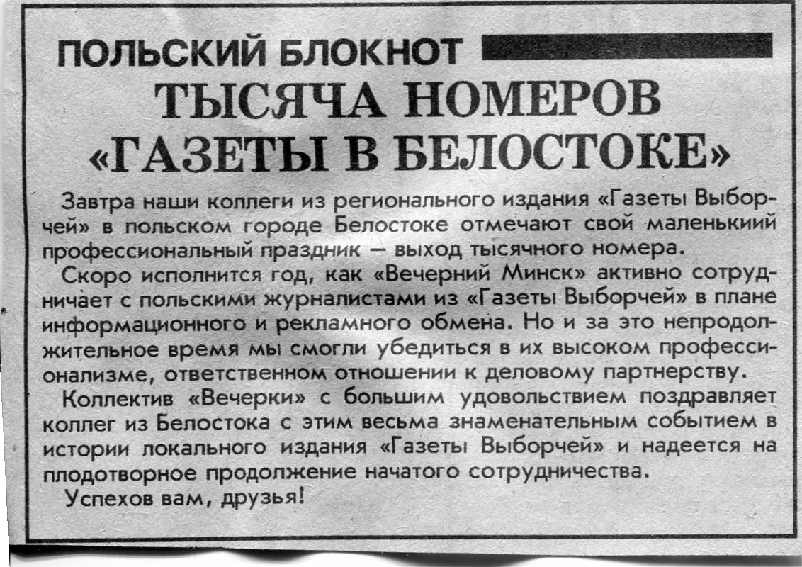 Тысяча номеров "Газеты в Белостоке" // Вечерний Минск. - 1995. - 29 сент.