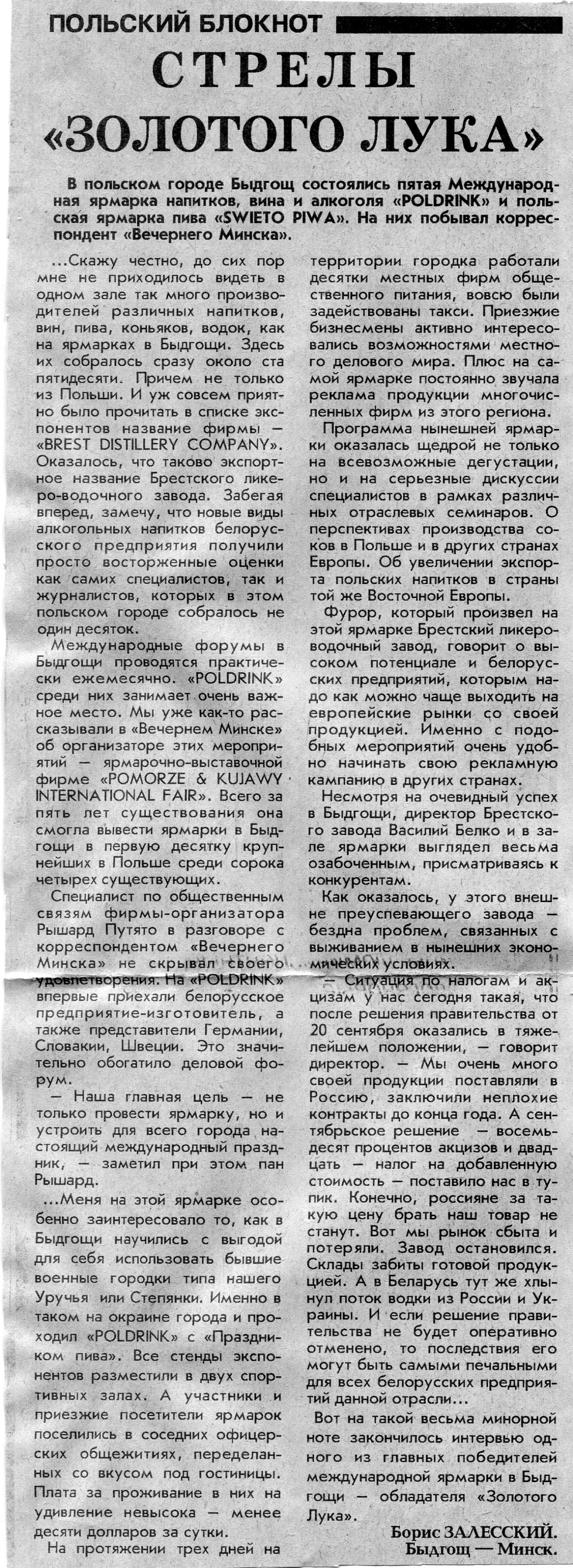 Залесский, Б. В Быдгощ - на праздник пива / Б. Залесский // Вечерний Минск. - 1995. - 29 сент.