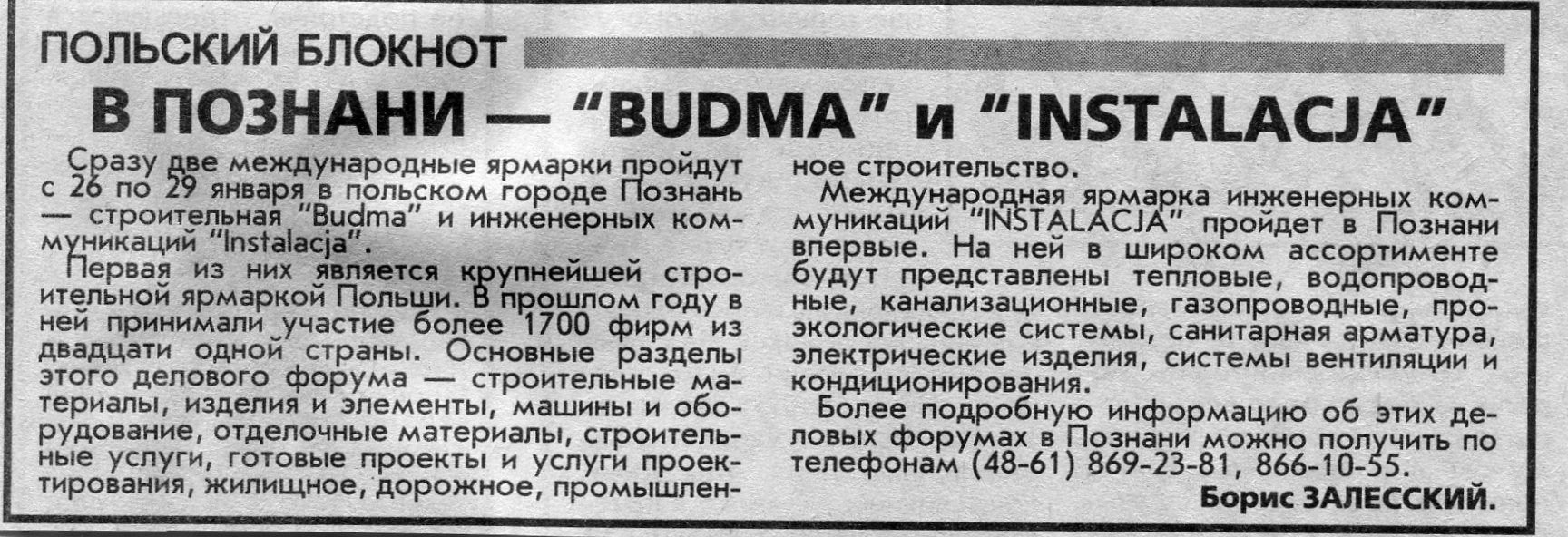 Залесский, Б. Познань собирает строителей / Б. Залесский // Вечерний Минск. - 2000. - 12 янв.