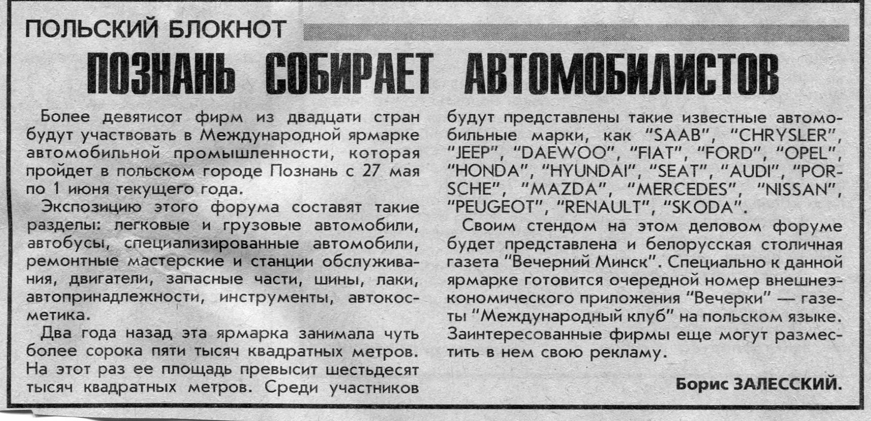 Залесский, Б. Познань собирает автомобилистов / Б. Залесский // Вечерний Минск. - 1999. - 7 мая.