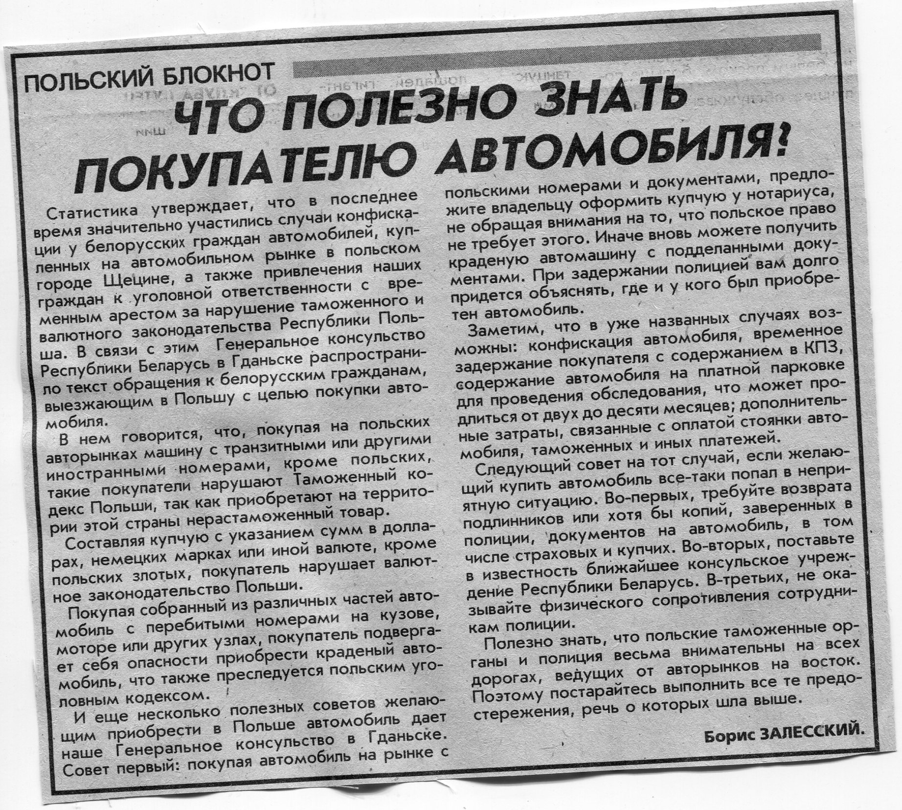 Залесский, Б. Что полезно знать покупателю автомобиля? / Б. Залесский // Вечерний Минск. - 1998. - 18 нояб.