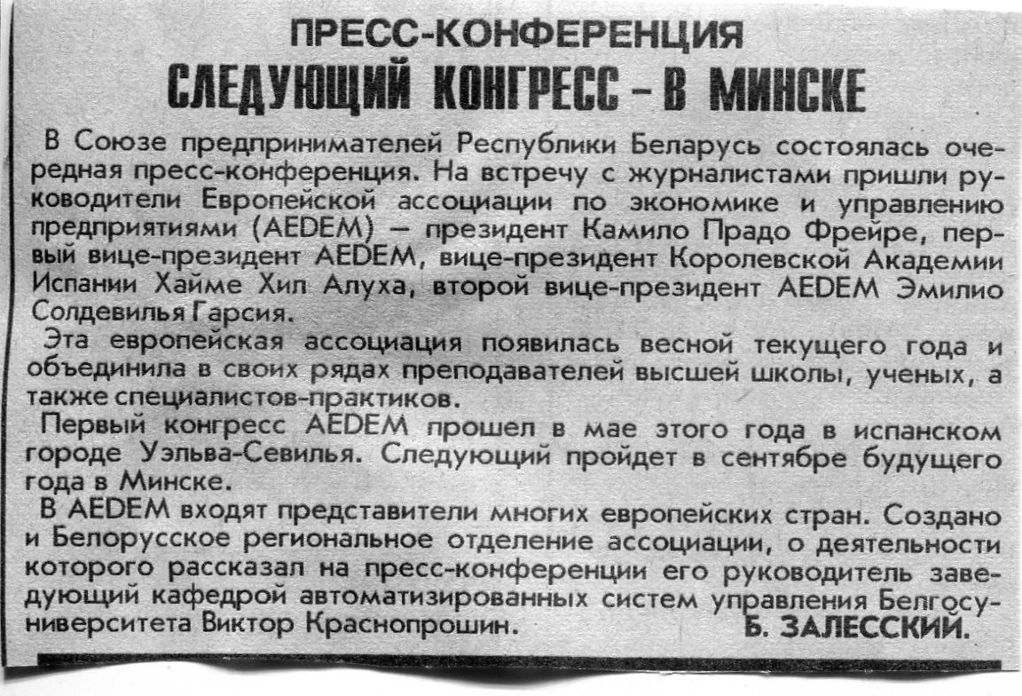 Залесский, Б. Следующий конгресс - в Минске / Б. Залесский // Вечерний Минск. - 1992.- 22 окт.