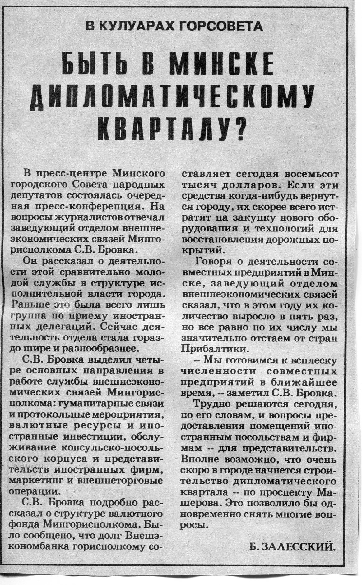 Залесский, Б. Быть в Минске дипломатическому кварталу? / Б. Залесский // Вечерний Минск. - 1992.- 27 мая.