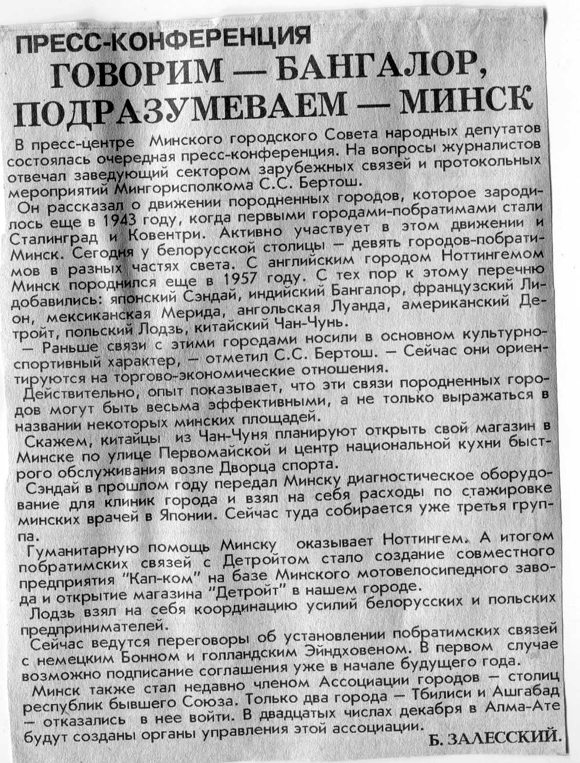 Залесский, Б. Говорим - Бангалор, подразумеваем - Минск / Б. Залесский // Вечерний Минск. - 1992.- 15 дек.