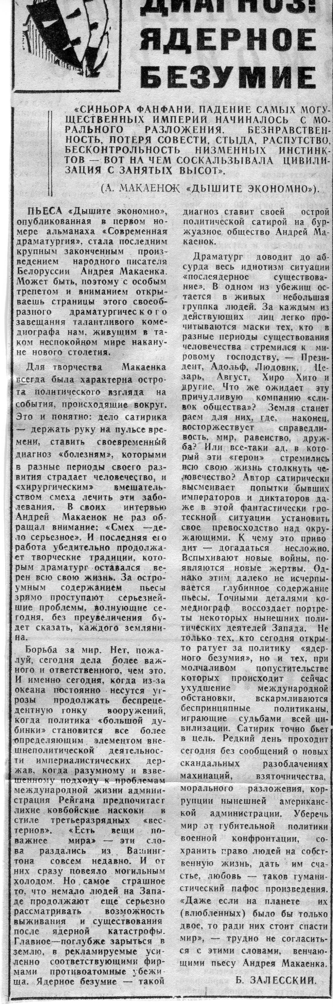 Залесский, Б. Диагноз: ядерное безумие / Б. Залесский // Трактор. - 1983. - 2 сент.